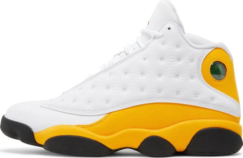 This Air Jordan 13 is expected to feature White leather on the panels . toe . and tongues with a matching liner. Other details include Yellow (Del Sol) suede overlays . Red appearing on the Jumpman tongue and outsole completed with a Black rubber sole.