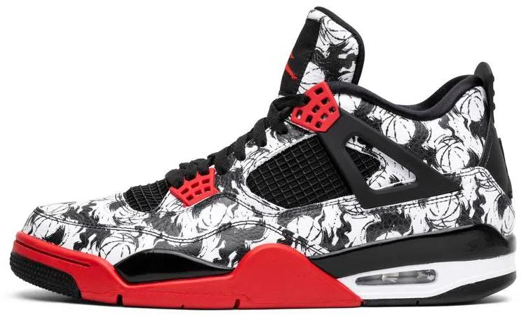 The Air Jordan 4 Retro ‘Tattoo’ takes the iconic silhouette back to its 1989 origins as a performance hoops shoe. The mid-top’s leather upper is entirely covered in a black-and-white basketball print . accented by contrasting pops of Fire Red on the molded eyelets and outsole. The Chicago Bulls-inspired color palette is finished with basic black on the structural wings . quarter-panel netting and Jumpman-embossed heel.
