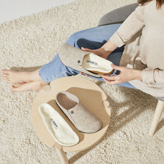 The Birkeqdfnstock Zermatt is our first true slipper. It features our iconic cork latex footbed, and to keep you extra cozy, it's fully lined in genuine shearling that will keep your feet warm all winter long. The upper consists of soft genuine wool.